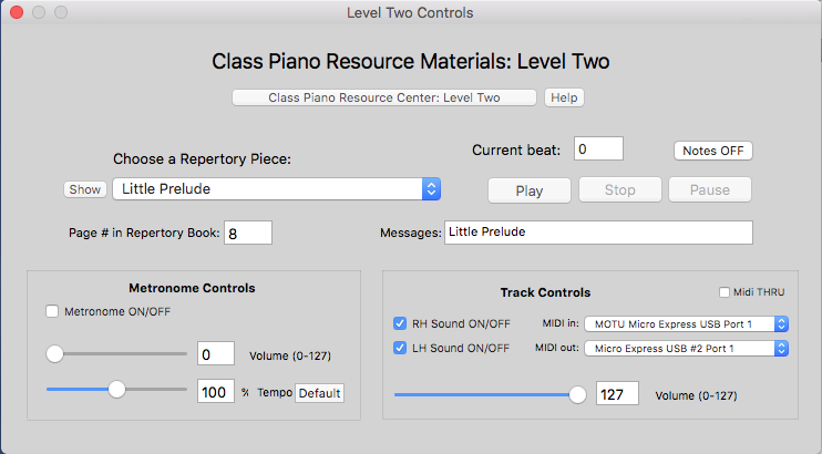 Class Piano Resources Computer SoftwareEach level of the Class Piano Resource Materials has an accompanying Mac OS application for interactive practice. These applications are MIDI sequencer controls which allow the student to practice interactively with each repertory selection of the book. Specifically: