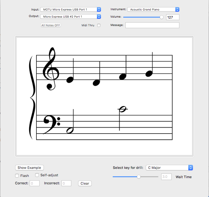---------- Interactive Note Speller for beginning piano. Drills notes based on the range selected. Counters for correct and incorrect responses. The student sees the note on the computer screen and then plays the note on a MIDI keyboard: